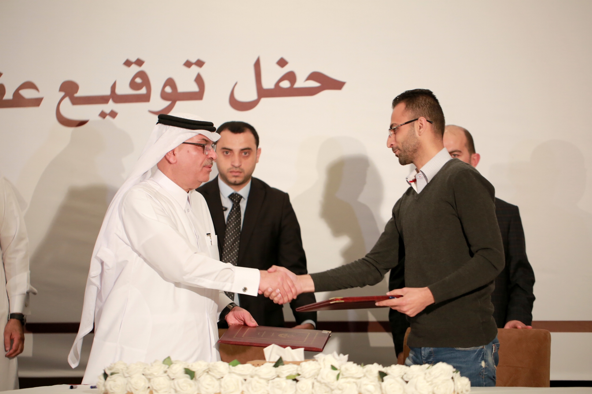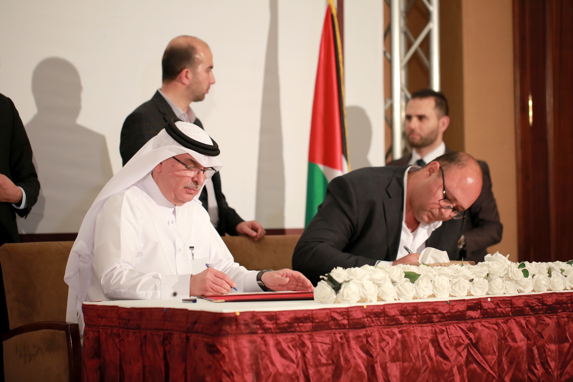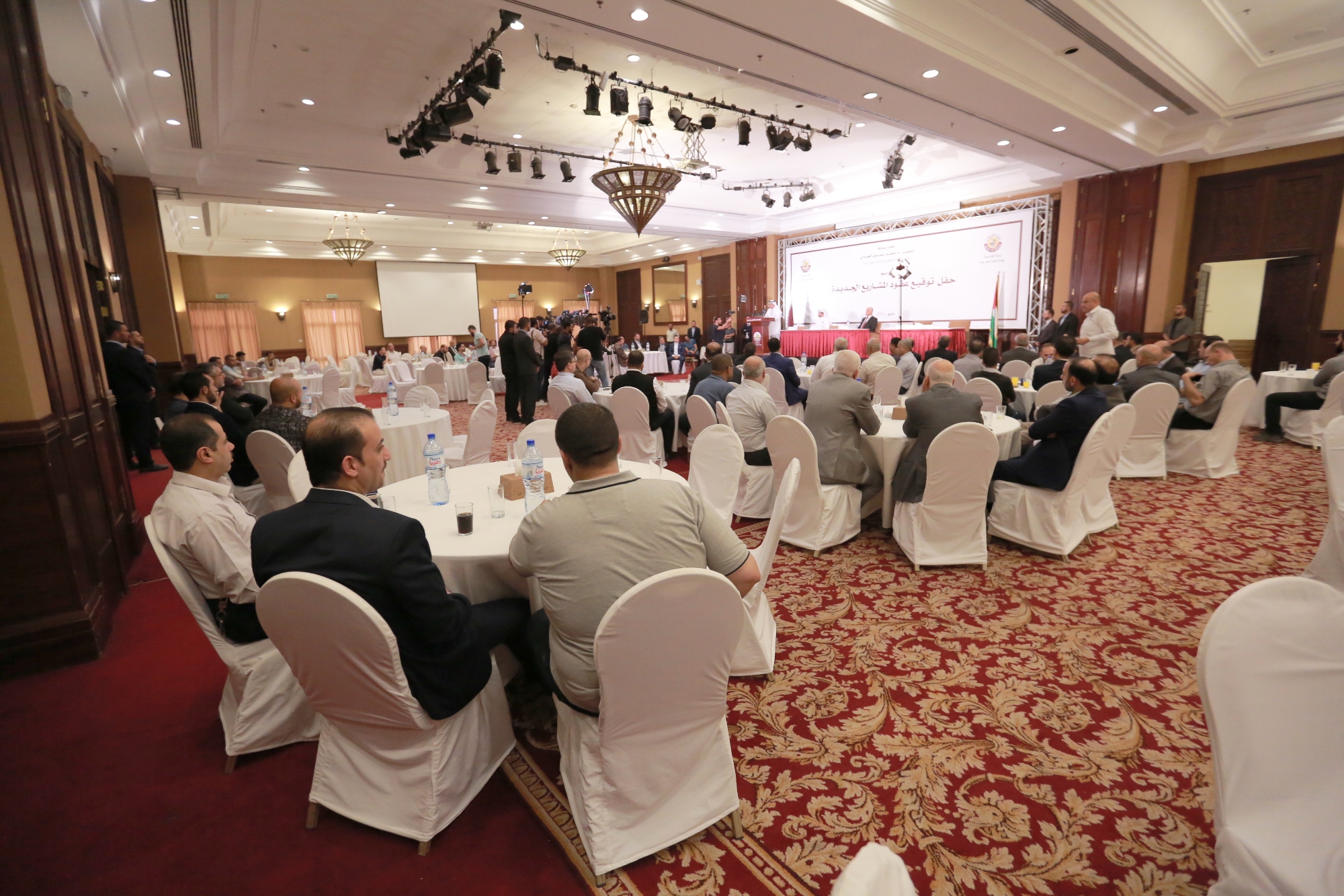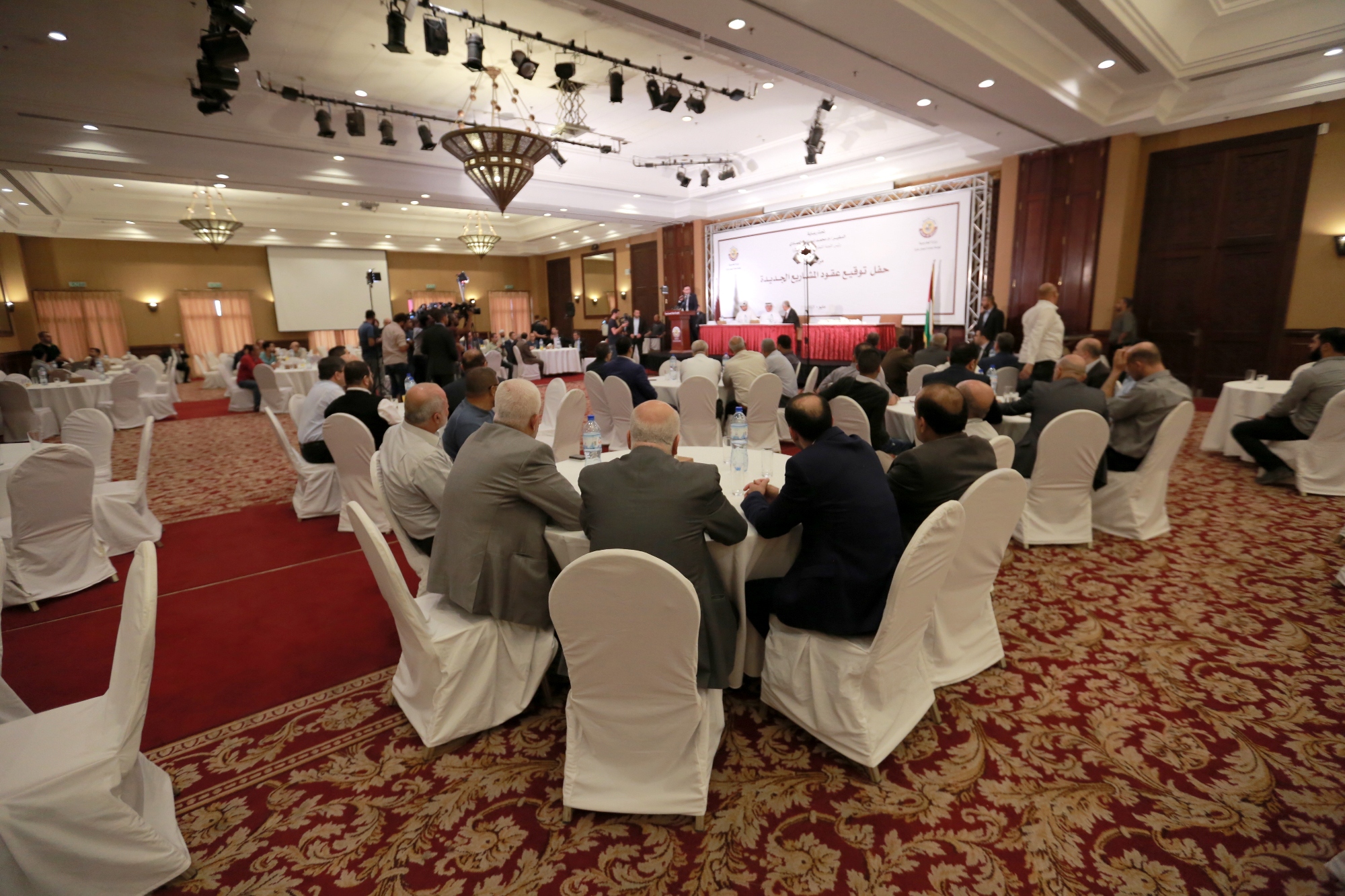 ووقّع السفير العمادي 13 عقدا مع مجموعة من الشركات الفلسطينية المحلية، منها عقود مقاولة وعقود توريدات وتجهيزات ومعدات وأثاث لعدد من المشاريع.