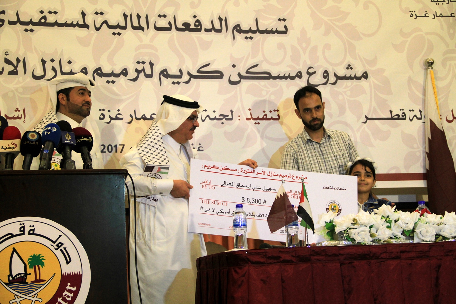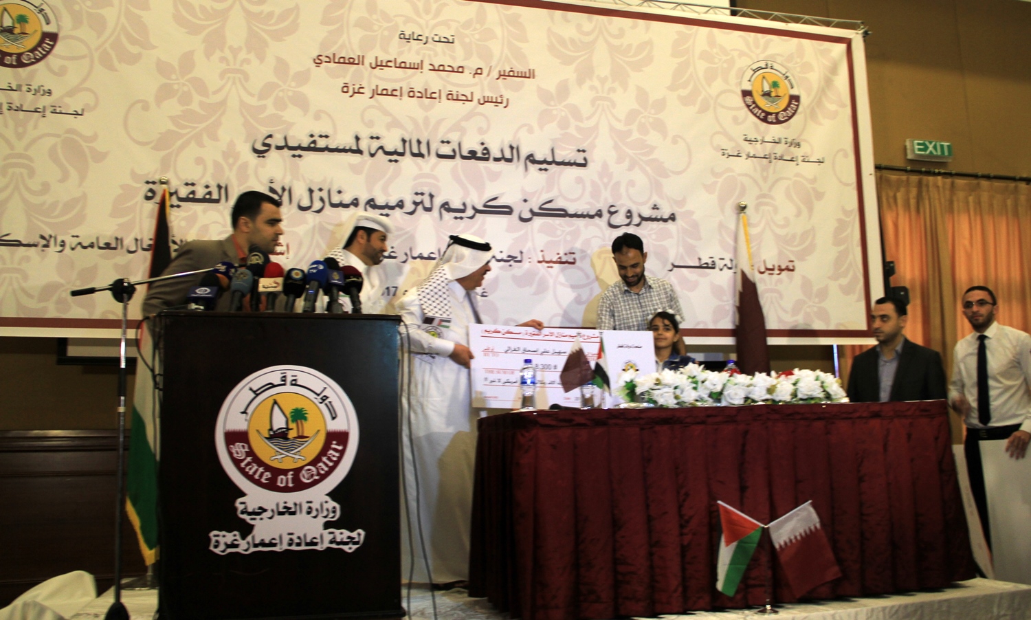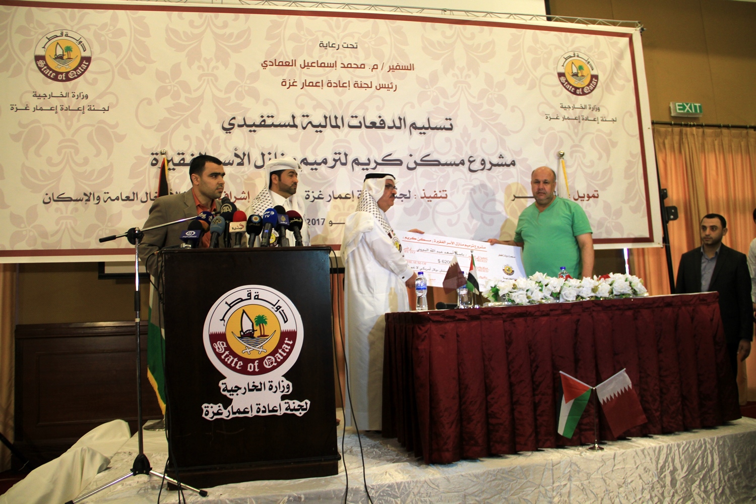 سلّم السفير محمد العمادي، رئيس لجنة إعادة إعمار غزة، الدفعة المالية الأولى لعدد من مستفيدي مشروع "مسكن كريم" لترميم منازل أسر فقيرة في قطاع غزة، ظهر اليوم الاثنين.