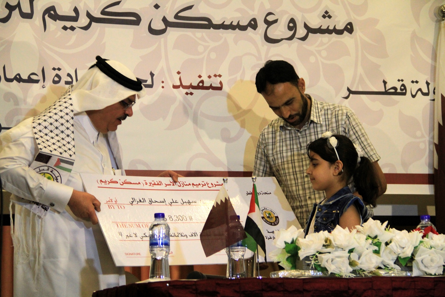 ونظمت اللجنة القطرية بالتعاون مع وزارة الأشغال العامة والإسكان بغزة حفلا لتسليم الدفعة المالية الأولى للقائمة الثانية من مستفيدي المشروع، والتي تشمل 26 أسرة من إجمالي المستفيدين البالغ عددهم 127 أسرة، تمت عملية اختيارهم من خلال المعاينة الميدانية والفحص وحسب الكشوفات المُفرزة والموجودة لدى وزارة الأشغال العامة والإسكان بغزة بالتوافق مع اللجنة القطرية.
