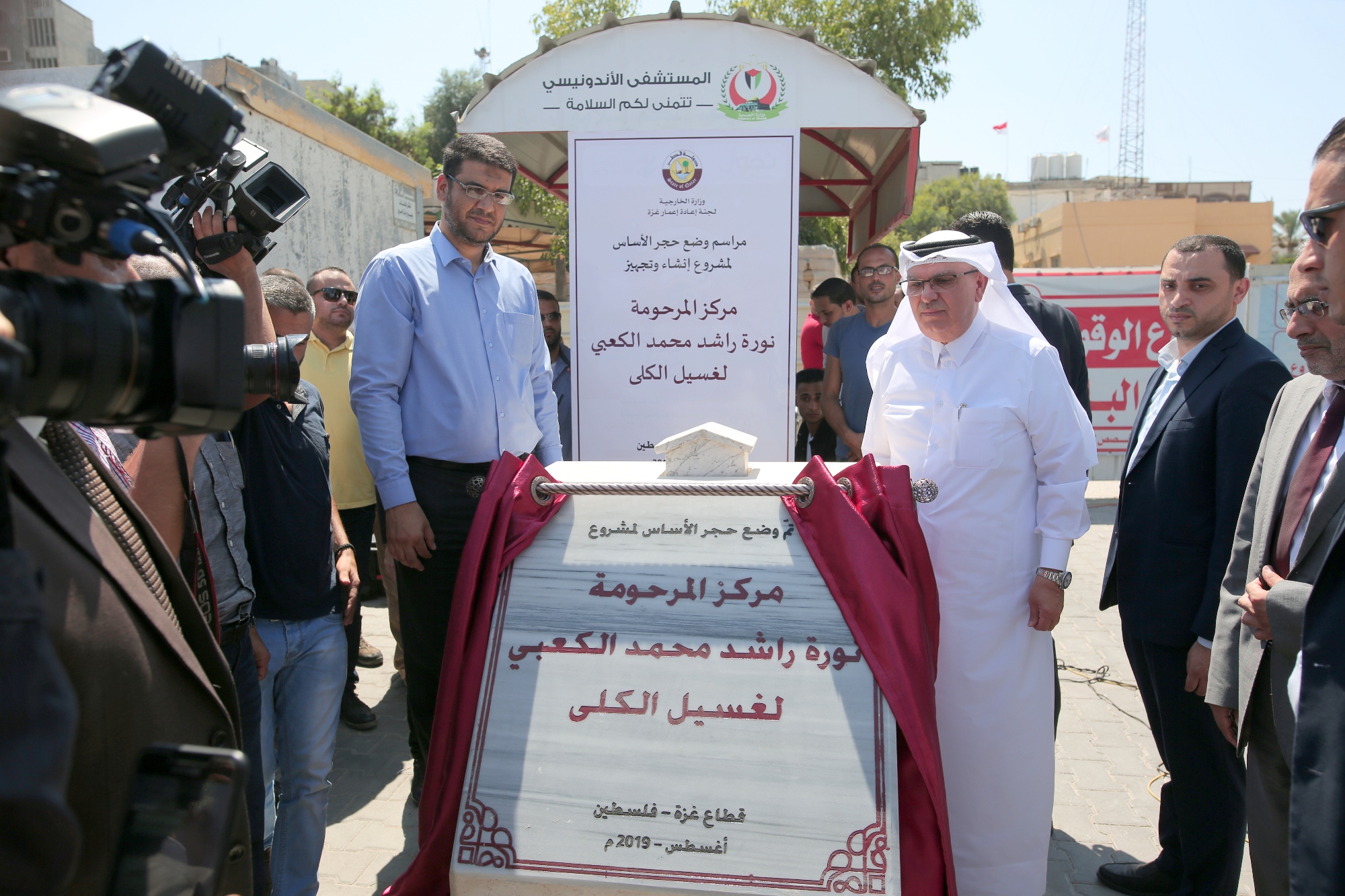 وضع السفير م. محمد العمادي رئيس اللجنة القطرية لإعادة إعمار غزة، برفقة د. يوسف أبو الريش وكيل وزارة الصحة الفلسطينية، حجر الأساس لمشروع إنشاء وتجهيز (مركز المرحومة نوره راشد محمد الكعبي لغسيل الكلى) في شمال قطاع غزة، اليوم السبت.