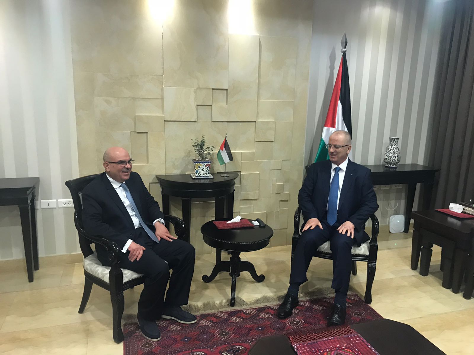 واستمع السفير العمادي من دولة الدكتور رامي الحمد الله لرؤية القيادة الفلسطينية والجهود التي تبذلها الحكومة للتخفيف من الأزمات التي يعاني منها سكان قطاع غزة، كما بحثا جملة من القضايا ذات الاهتمام المشترك وعلى رأسها قضية المصالحة الفلسطينية وكذلك آخر المستجدات فيما يتعلق بتنفيذ المشاريع القطرية.