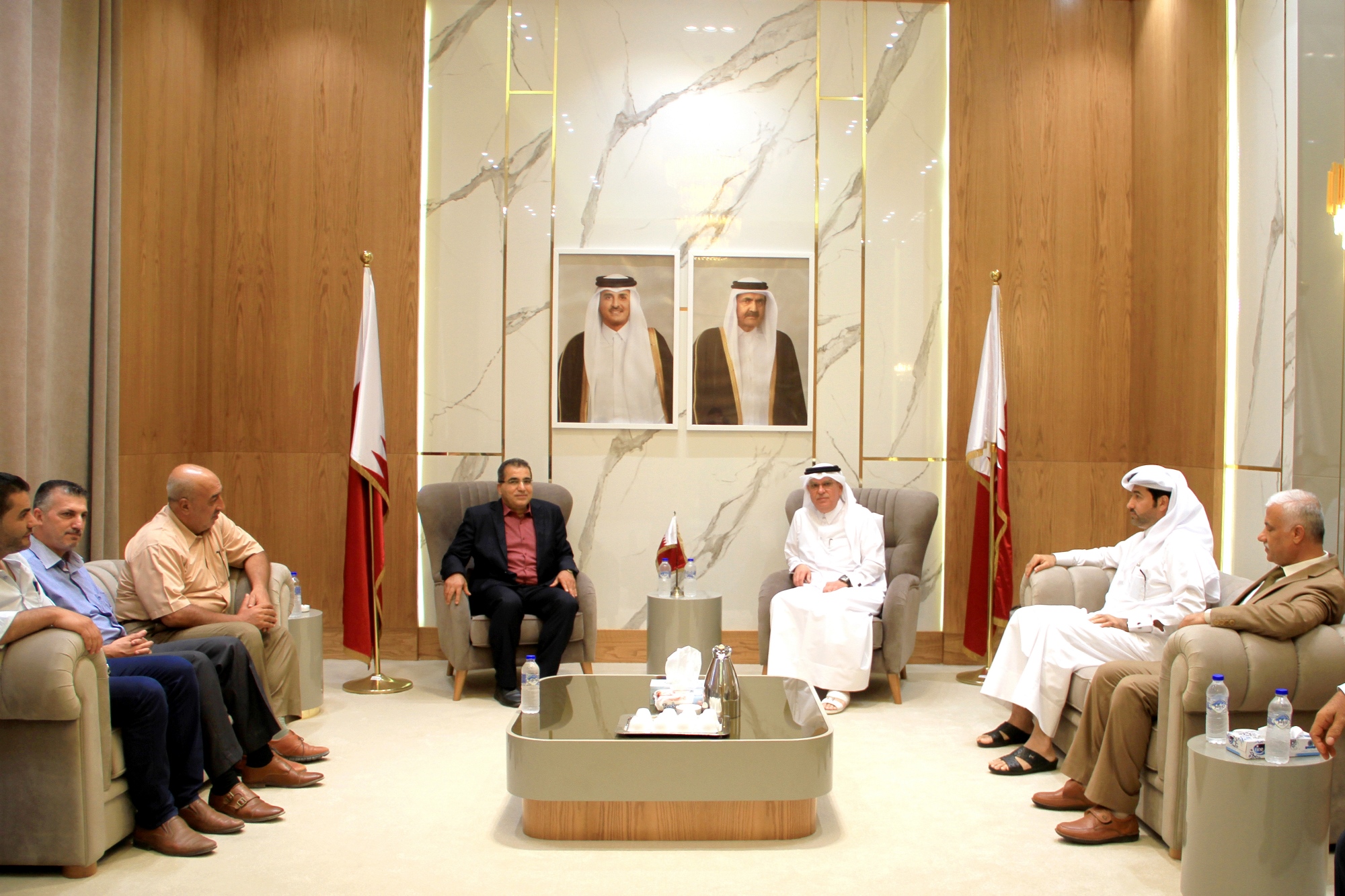 والتقى السفير العمادي ونائبه أ. خالد الحردان، برئيس اتحاد المقاولين الفلسطينيين م. علاء الأعرج، ونائبه م. أيمن جمعة، وباقي أعضاء اتحاد المقاولين في المحافظات الجنوبية.